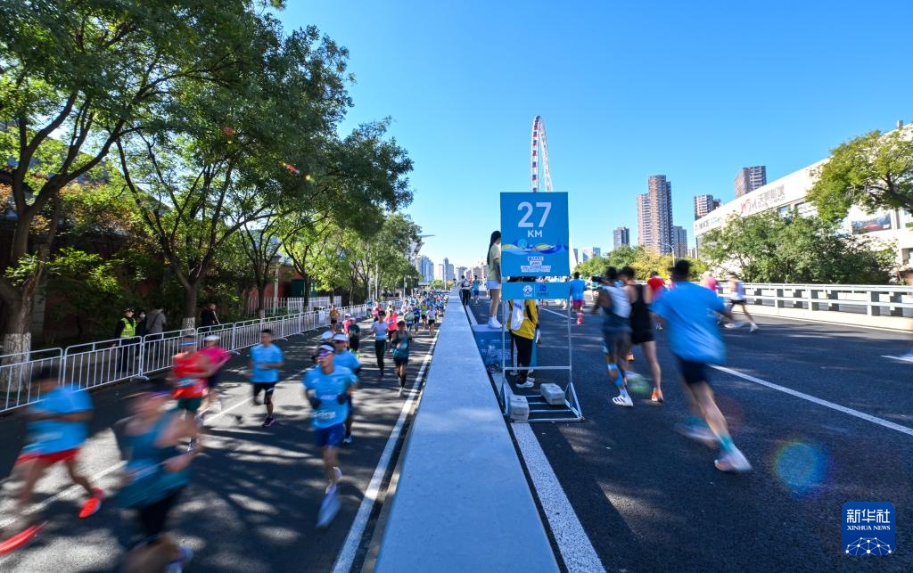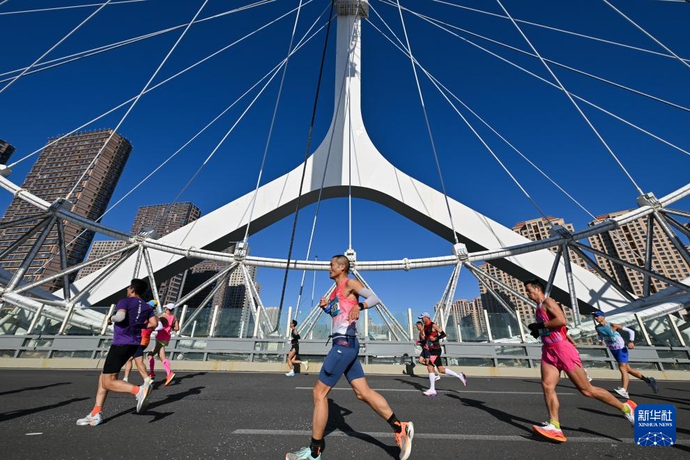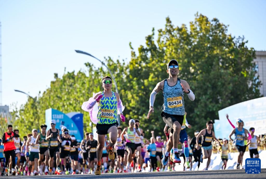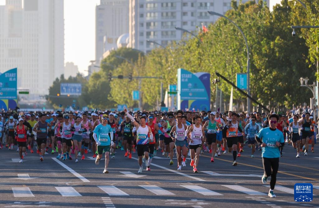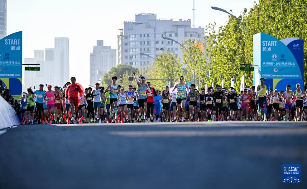 當日,2025天津馬拉松鳴槍開跑。賽事吸引了約三萬名跑者參加。