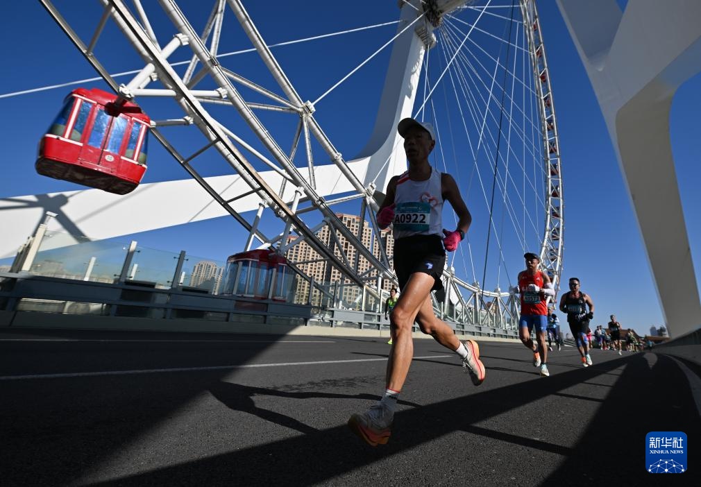 10月26日,參賽選手在比賽中跑過“天津之眼”摩天輪。