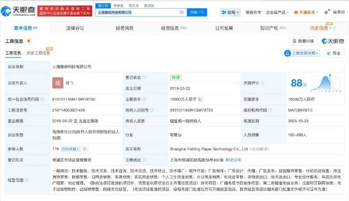 天眼查App顯示,近日,上海疊紙科技有限公司發生工商變更,姚潤昊卸任該公司法定代表人、執行董事,由姚飛接任法定代表人并擔任董事。