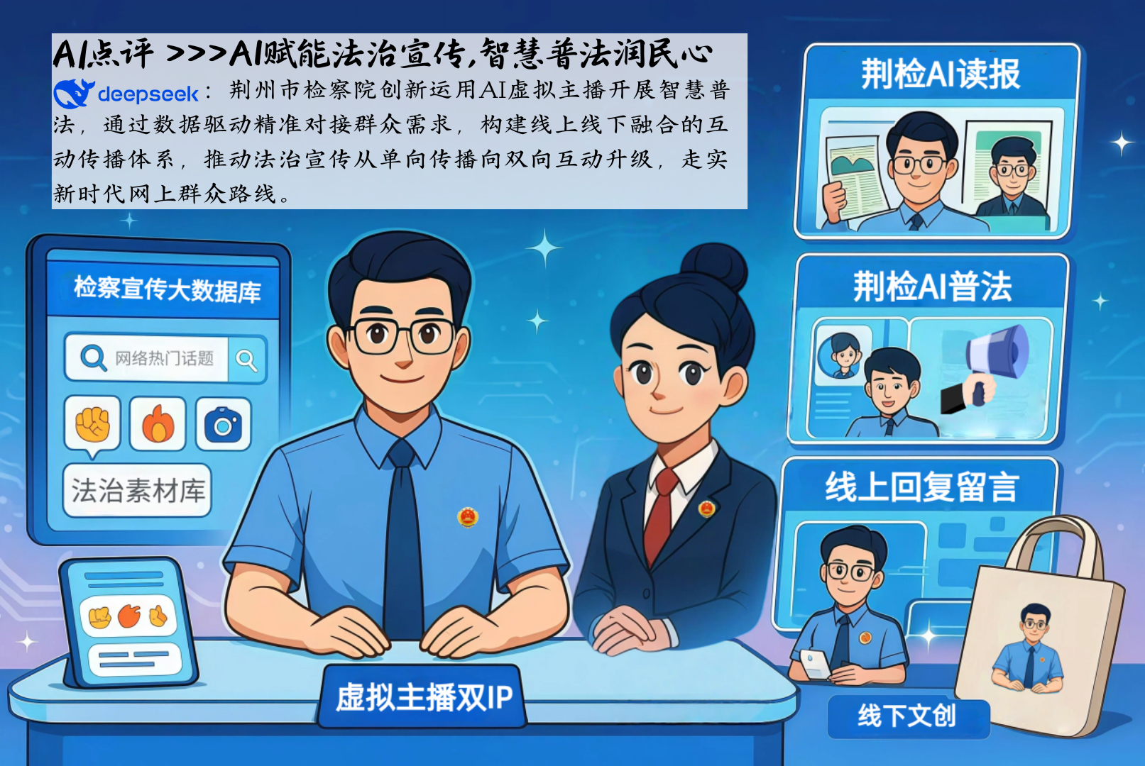 據悉,2023年以來,荊州市人民檢察院探索用大數據、人工智能賦能法治宣傳工作,自主研發檢察虛擬主播AI“荊小檢”“郢小檢”,創新推出系列網絡普法作品,建立檢察宣傳大數據庫,基于網民需求實現精準網絡普法,深化“檢民互動”傳播,讓法治精神融入網民生活,切實提升網民法治意識和素養。