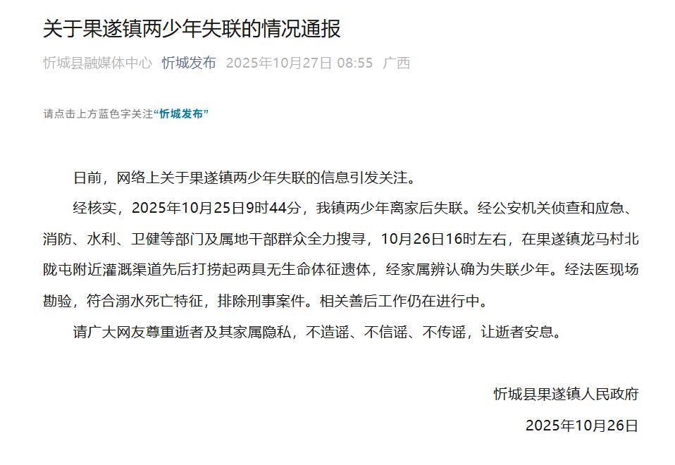 另?yè)?jù)忻城縣果遂鎮(zhèn)人民政府稍早前發(fā)布情況通報(bào):經(jīng)核實(shí),2025年10月25日9時(shí)44分,我鎮(zhèn)兩名少年離家后失聯(lián)。經(jīng)公安機(jī)關(guān)偵查和應(yīng)急、消防、水利、衛(wèi)健等部門(mén)及屬地干部群眾全力搜尋,10月26日16時(shí)左右,在果遂鎮(zhèn)龍馬村北隴屯附近灌溉渠道先后打撈起兩具無(wú)生命體征遺體,經(jīng)家屬辨認(rèn)確為失聯(lián)少年。經(jīng)法醫(yī)現(xiàn)場(chǎng)勘驗(yàn),符合溺水死亡特征,排除刑事案件。相關(guān)善后工作仍在進(jìn)行中。