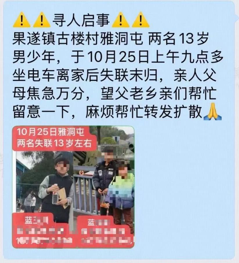 據(jù)家屬發(fā)布的尋人啟事,10月25日上午9時(shí)許,來(lái)賓市忻城縣果遂鎮(zhèn)古樓村雅洞屯兩名13歲男孩騎電瓶車(chē)離家失聯(lián)未歸,希望網(wǎng)友幫忙提供線(xiàn)索。