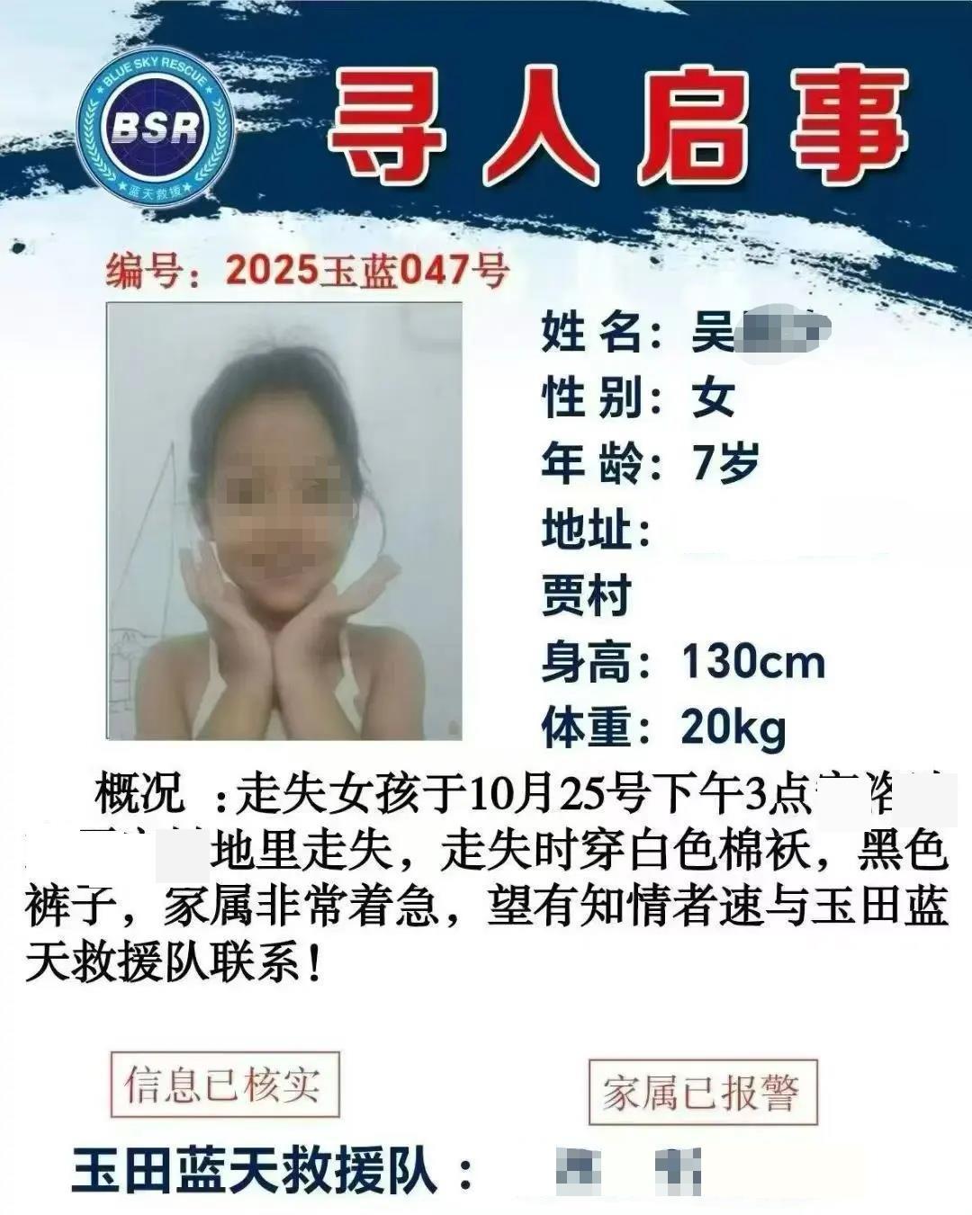 據網友轉發的多個版本的尋人啟事,小女孩姓吳,今年7歲,于10月25日下午3時許在玉田縣窩洛沽鎮東賈莊村走失。有尋人啟事和知情網友稱,當時小女孩是隨家屬外出時在農田里走失。