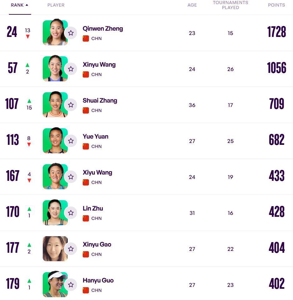 在最新的Top100名單上,中國金花僅有鄭欽文和王欣兩人。