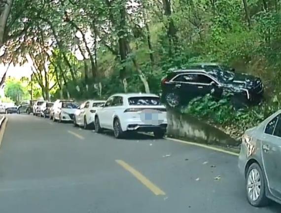 行車記錄儀顯示,黑色SUV本在白色SUV尾部倒車,但未能及時剎住,倒上路邊斜坡,并在斜坡上繼續(xù)倒車直至車尾落下邊坡,架在白色SUV的車頭上。相關視頻顯示,事故發(fā)生后有吊車前往救援。