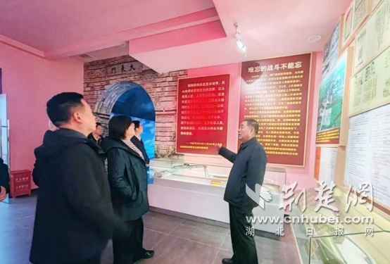 鐘祥市老促會副會長、鐘祥市大洪山革命歷史紀念館館長何平(右一)向王玲(左二)一行講述鐘祥革命歷史。 通訊員 供圖