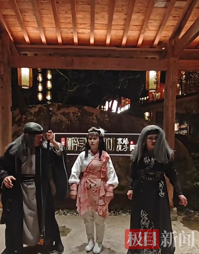 10月26日晚7時許,夜幕低垂,位于襄陽市的“農里醉美鄉村·襄陽院子”餐廳燈火通明。步入餐廳,仿佛走進江南園林,亭臺樓閣、流水潺潺,景致宜人。演出區域內,郭靖、黃蓉、梅超風三位金庸筆下的角色正上演精彩打戲。“快看那是誰?快來拍照!”不少食客一邊用餐,一邊舉起手機記錄,還有人實時視頻連線未能到場的親友。
