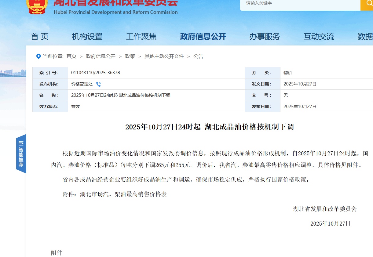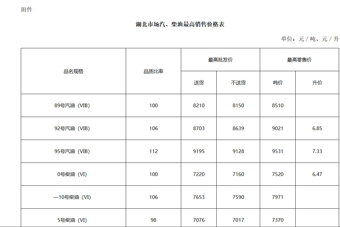 湖北日報訊(記者謝慧敏)油價又要下調了!10月27日從省發改委價格管理處獲悉,自10月27日24時起,湖北省內92號、95號汽油、0號柴油分別下調0.21元、0.23元、0.22元;調價后,92號、95號汽油分別降至每升6.85元、7.33元,0號柴油降至每升6.47元。