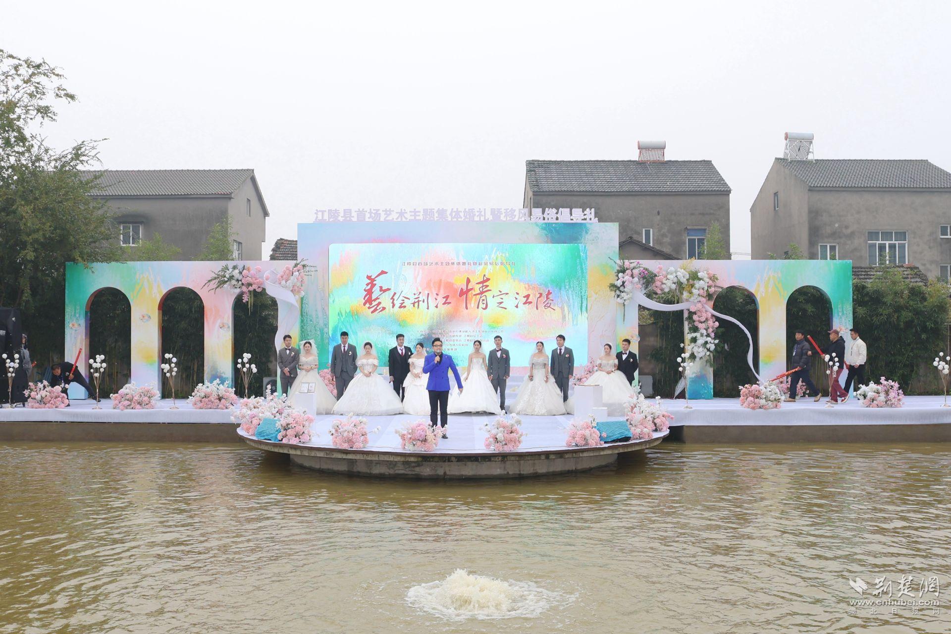 荊楚網(湖北日報網)訊( 通訊員 唐華、陳理君、肖琦、郝光東)10月25日,“荊生荊世·愛在江陵”之“藝繪荊江·情定江陵”集體婚禮在陳澤鯤長河藝術館浪漫落幕,近百名青年男女與親友團現場見證了6對新人簡約而溫馨的婚禮。