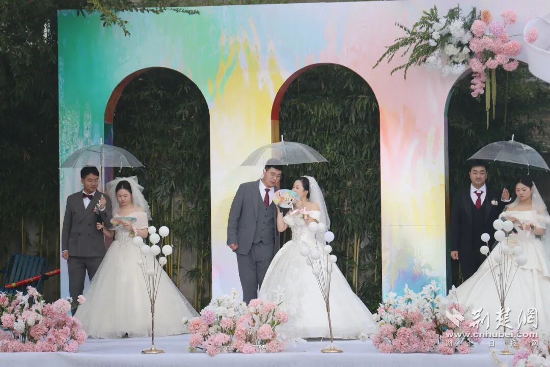 首場藝術主題集體婚禮在荊州本土音樂人王翼焱《把愛留在荊州》《改寫人生》的優美旋律中拉開序幕,6對新人以簡約莊重的儀式,踐行婚俗新風。青年代表宣讀《文明婚俗倡議書》;新人攜手宣讀婚禮誓言、交換戒指、分享相識相戀相知相愛的甜蜜和幸福;特邀證婚人陳澤鯤將大家集體涂鴉的祝福二次創作為《丹青證愛》油畫作品;更有書法家以墨為情、以筆為證,為每對新人書寫專屬結婚祝福,讓傳統文化與現代婚俗完美交融。