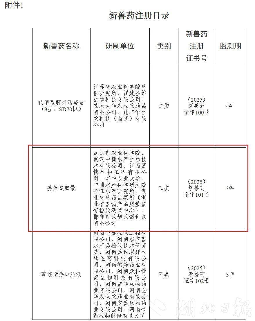 湖北日報訊(記者汪彤、通訊員劉珂)10月27日從武漢市農科院獲悉,由該院聯合中國水產科學院長江水產研究所、武漢中博水產生物技術有限公司等單位聯合研發的華中地區首款漁用中草藥提取制劑——“姜黃提取散”正式獲批國家三類新獸藥證書,即將投入市場。這標志著我省在水產養殖動物肝損傷防控領域取得新進展,對推動水產養殖業綠色健康發展具有積極意義。