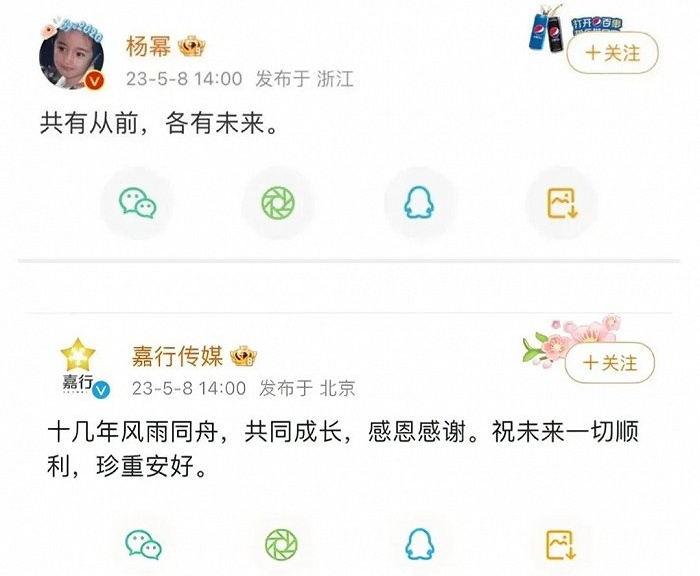 2023年5月,楊冪就已經發微博宣布與嘉行傳媒解約,結束了長達十幾年的合作關系。但那時,楊冪手里依然持有嘉行15.18%的股份,直至退出股東,才徹底與嘉行”人財兩清“。