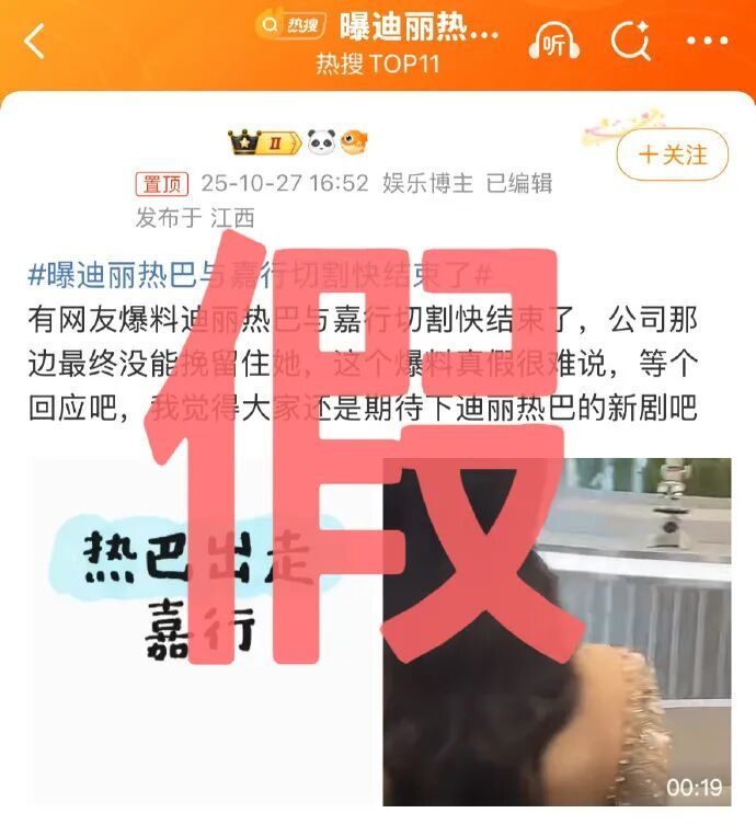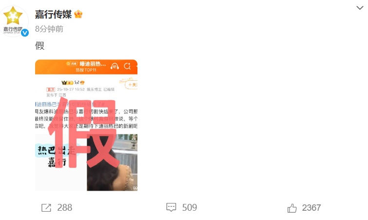 10月27日,嘉行傳媒發文否認“與迪麗熱巴切割快結束了”。
