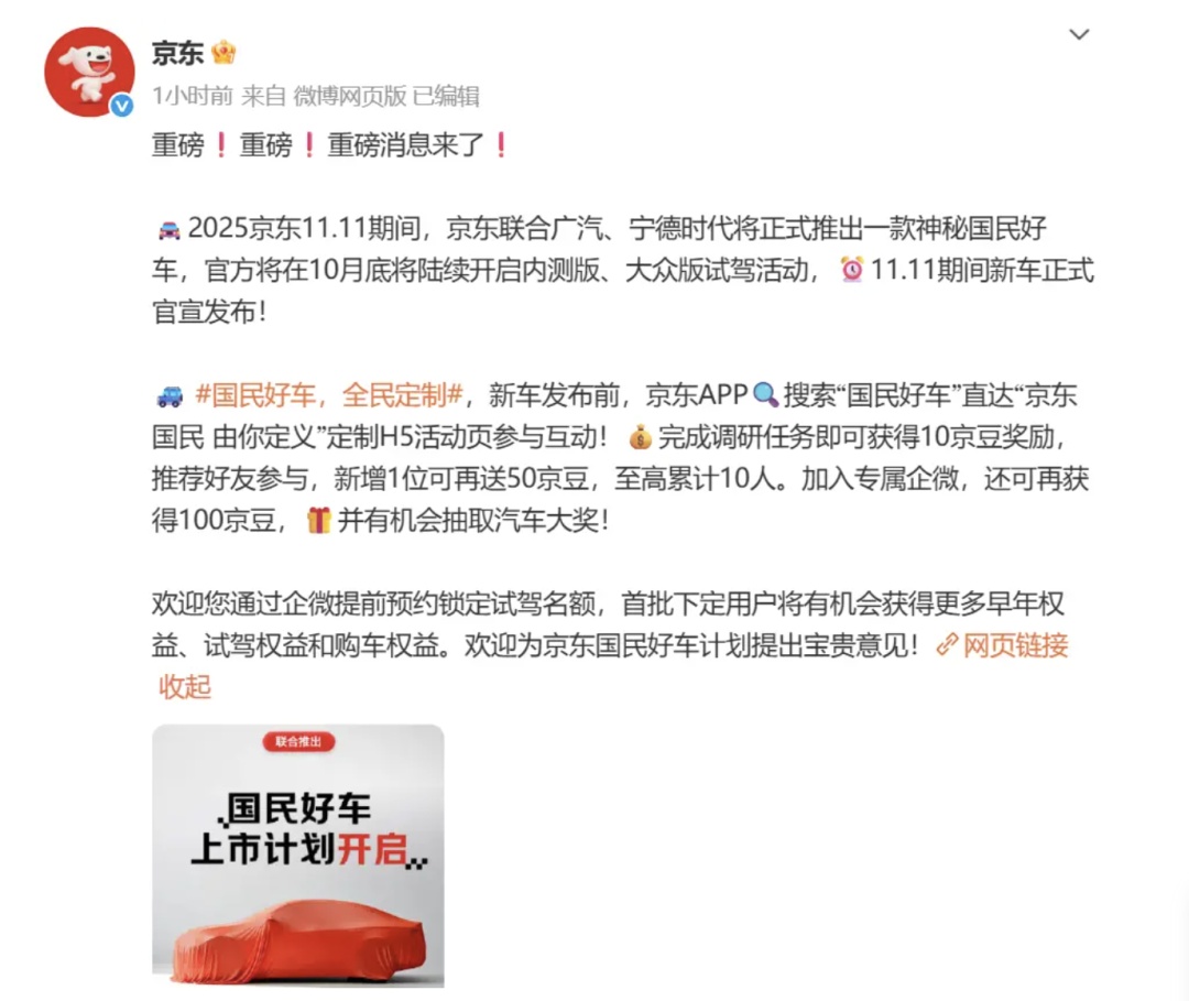 10月14日,京東微博宣布,聯合廣汽、寧德時代將推出一款汽車,官方將在10月底陸續開啟內測版、大眾版試駕活動,11月9日新車正式官宣發布。