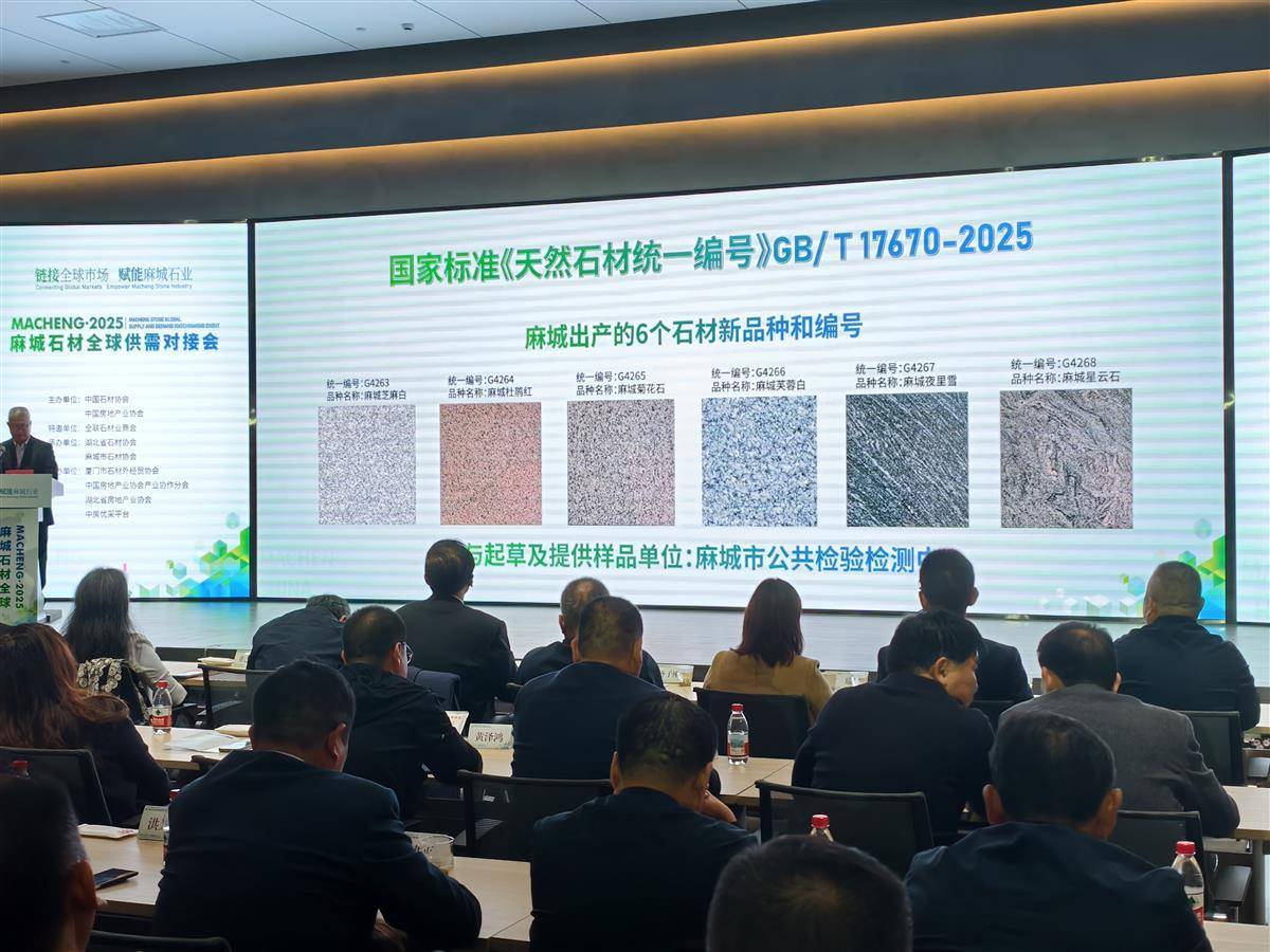 湖北日報訊(記者劉毅、通訊員陳曉輝、羅威)“麻城芝麻白、麻城芙蓉白、麻城菊花石、麻城杜鵑紅、麻城星云石、麻城夜里雪,恭喜這6種麻城石材被納入全國標準!”10月27日,隨著全國石材標準化技術委員會秘書長周俊興宣布,2025麻城石材全球供需對接會現場響起熱烈掌聲,這是時隔26年之后,又有6種麻城石材被納入國標體系,標志著該市石材產業標準化建設又邁進一大步。