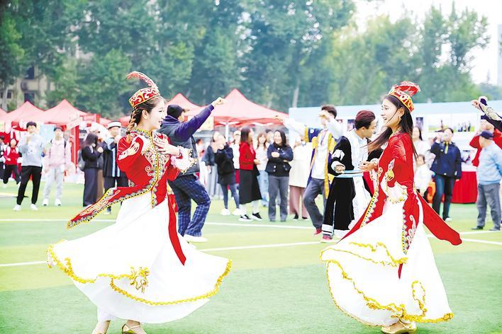 10月25日,華中科技大學“同心筑夢新征程,同行共繪華夏情”第十二屆“石榴紅”文化節火熱開展,身著民族服飾的學生們載歌載舞。