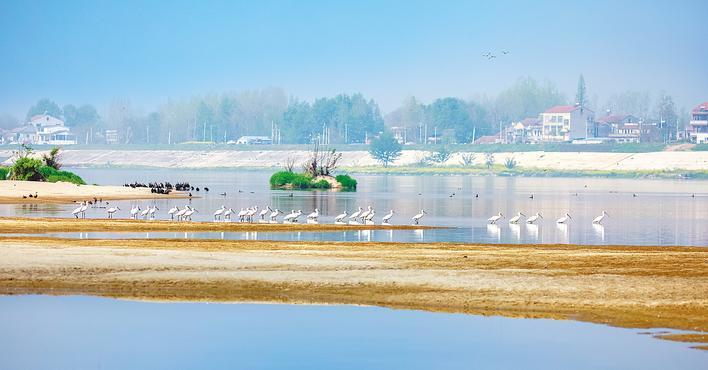 正值候鳥遷徙季,成群的候鳥棲息在漢江濕地。 (湖北日報通訊員 王曉紅 攝)