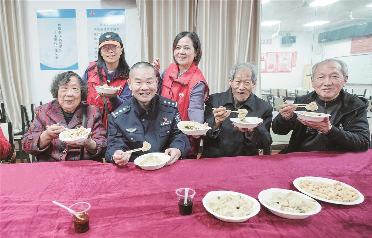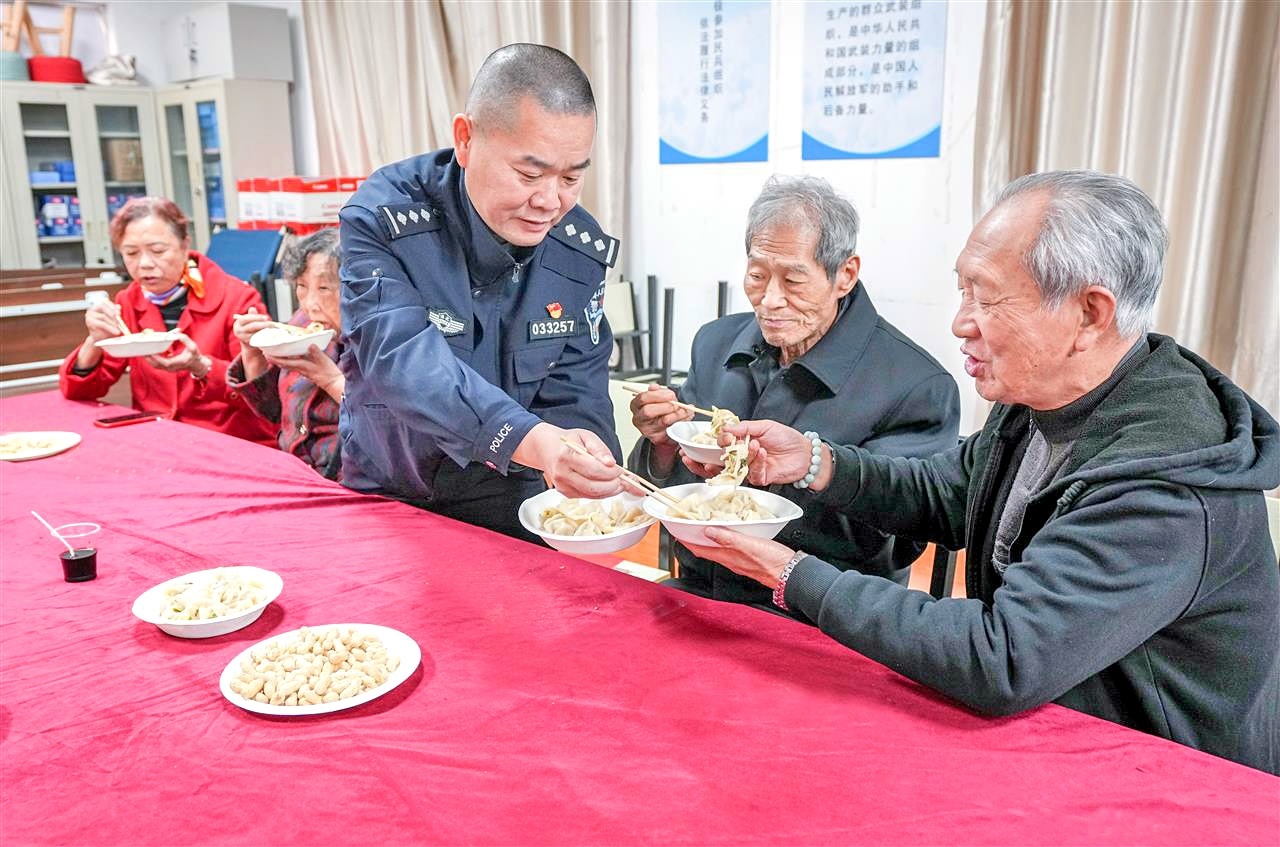 重陽將至,10月27日中午,在武漢市青山區新溝橋街道新橋社區,一場暖意融融的餃子宴正在進行。社區民警邵奇邀請獨居老人過節,老人們笑得合不攏嘴,邵奇為他們盛上熱氣騰騰的餃子,還不時詢問口味咸淡。“花生爹爹”秦爹爹也端來五香花生與大家分享,香氣四溢中,社區群干、志愿者和居民們邊吃邊聊,其樂融融。