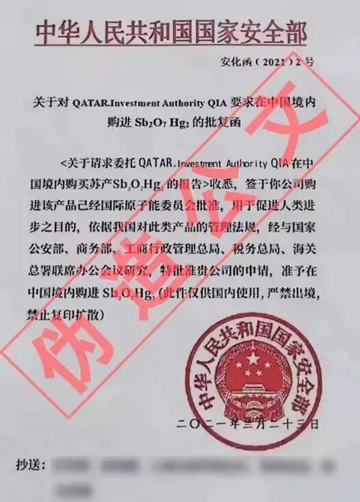 國(guó)家安全機(jī)關(guān)工作發(fā)現(xiàn),有不法分子偽造國(guó)家安全部等機(jī)關(guān)單位紅頭文件,以參與化學(xué)品“Sb2O7Hg2”(俗稱“紅汞”)交易可獲利為名,精心編織騙局,誆騙群眾錢財(cái)。近日,國(guó)家安全機(jī)關(guān)會(huì)同相關(guān)部門破獲一起“紅汞騙局”案,現(xiàn)將騙術(shù)細(xì)節(jié)公之于眾,提醒廣大民眾增強(qiáng)防范意識(shí),守護(hù)好自己的“錢袋子”。