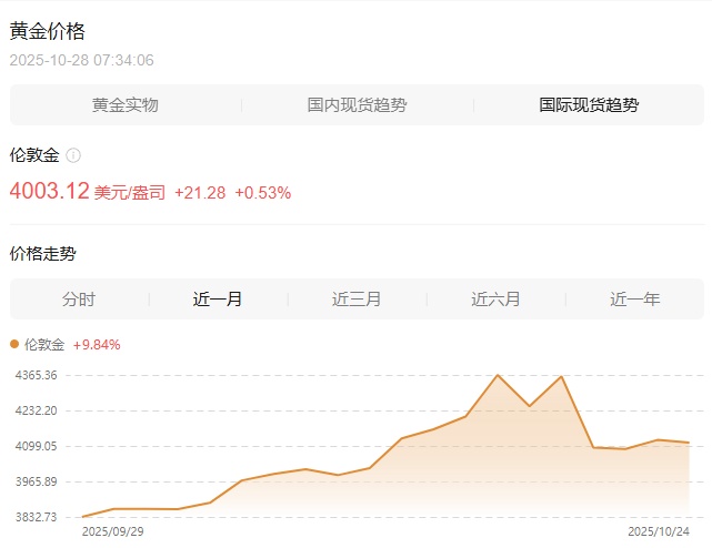 現貨黃金突破4000美元/盎司,日內漲0.50%。