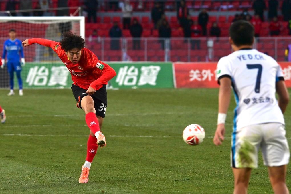 10月26日,遼寧鐵人隊球員田德澳(左)在比賽中射門。新華社記者 吳青昊 攝