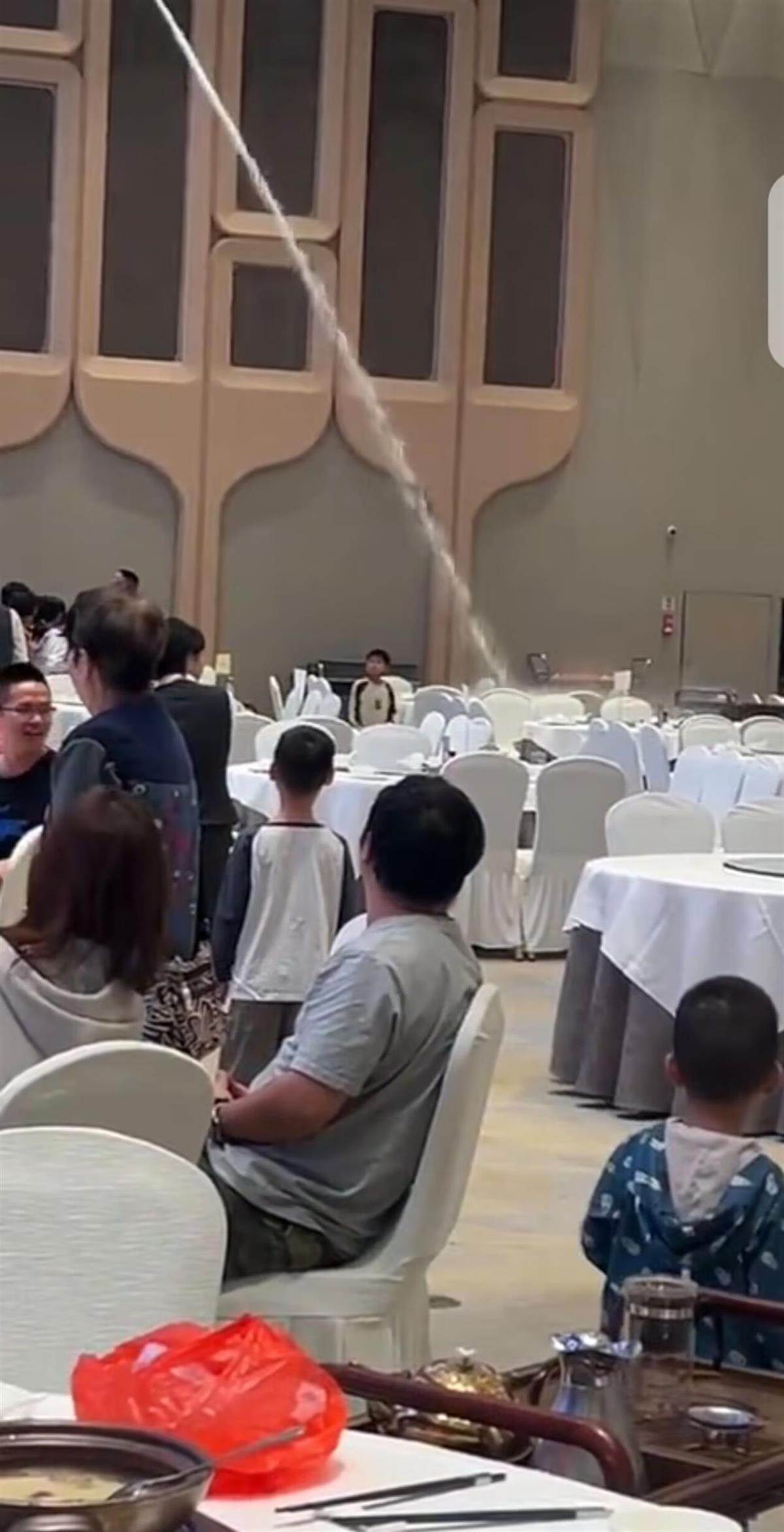 視頻顯示,不少人在一個宴會廳內吃飯,一根水柱從天花板上一根水管處流出,直射到桌子上,附近食客紛紛避讓。記者給發布視頻的網友留言,一直沒有得到回復。