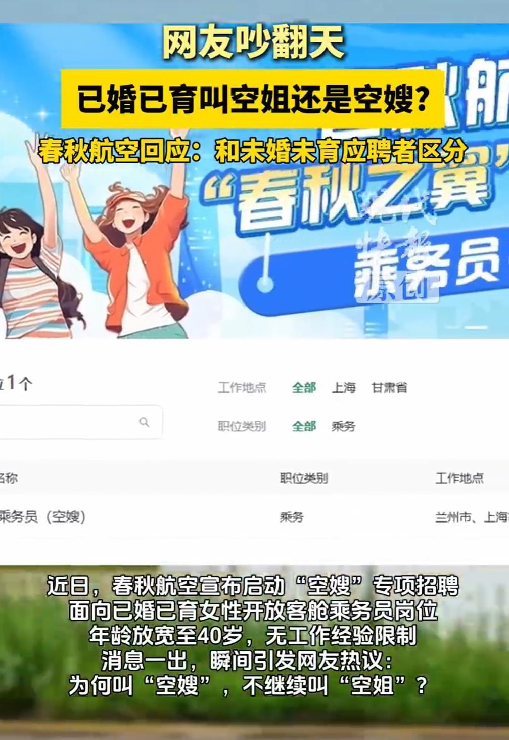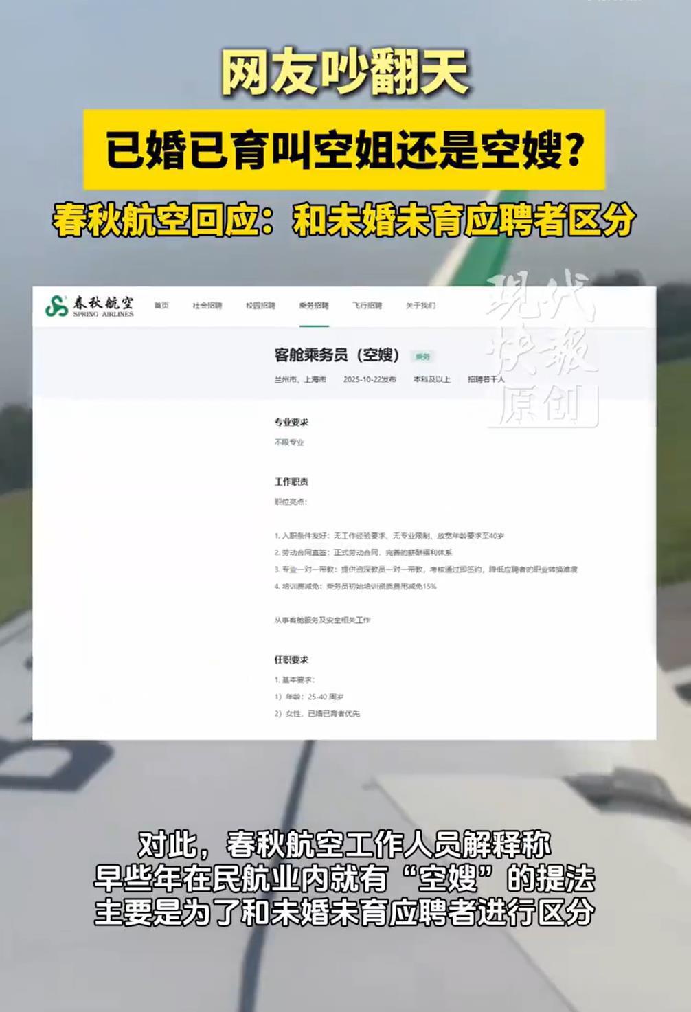 10月27日,春秋航空工作人員解釋稱,早些年在民航業內就有“空嫂”的提法,主要是為了和未婚未育應聘者進行區分,“就崗位工作性質、工作內容等而言,空姐和空嫂是沒有區別的,此舉旨在優化客艙服務,提升旅客出行體驗。”(據10月28日現代快報)