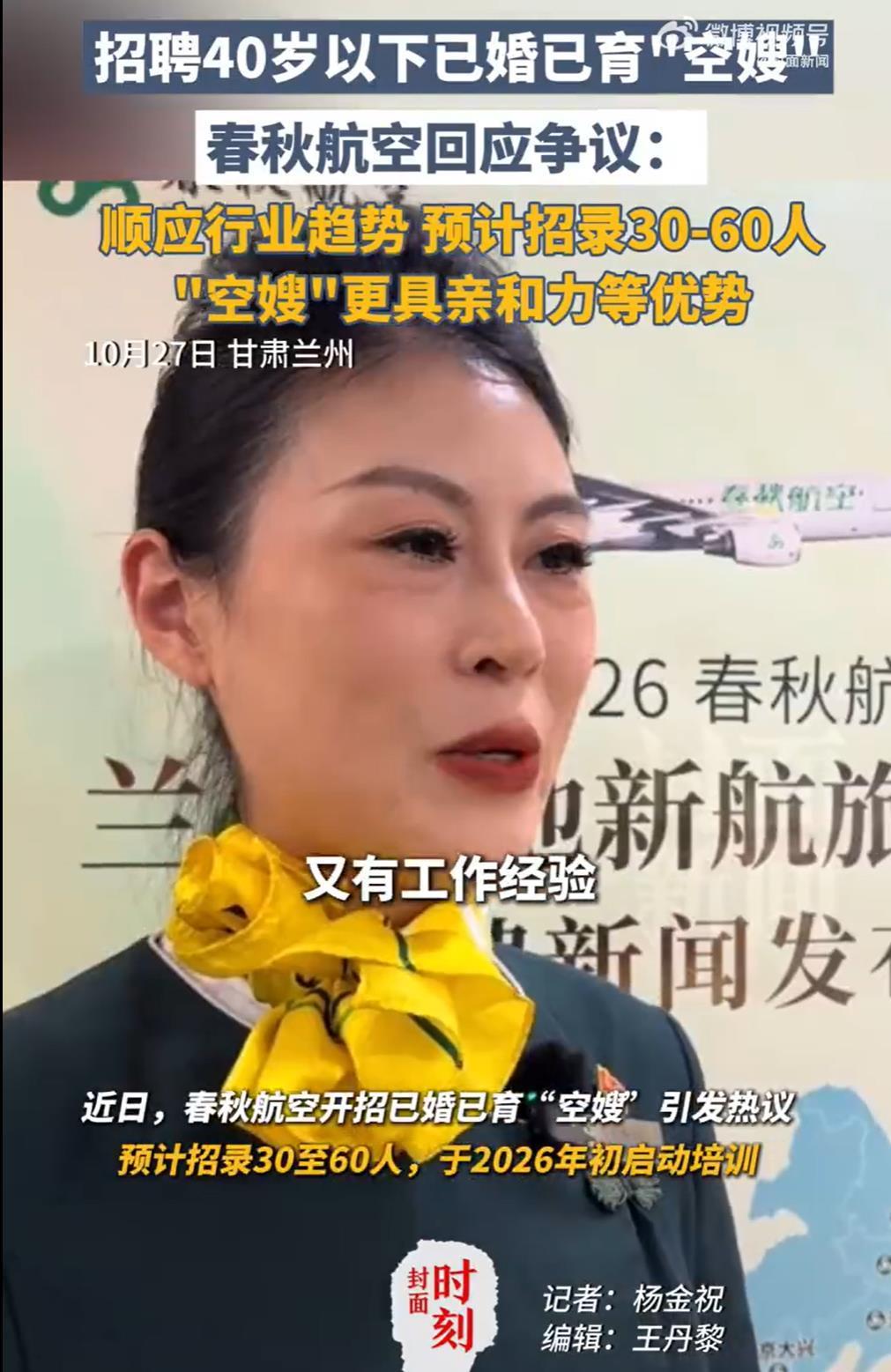 近日,春秋航空宣布啟動“空嫂”專項招聘,面向已婚已育女性開放客艙乘務員崗位,年齡放寬至40歲,學歷要求為全日制本科及以上,身高162cm至174cm,無工作經驗限制。