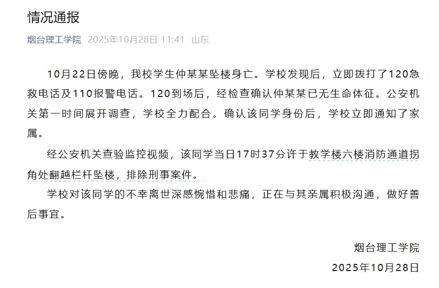 煙臺(tái)理工學(xué)院10月28日通報(bào),10月22日傍晚,學(xué)校學(xué)生仲某某墜樓身亡。學(xué)校發(fā)現(xiàn)后,立即撥打了120急救電話及110報(bào)警電話。120到場(chǎng)后,經(jīng)檢查確認(rèn)仲某某已無生命體征。公安機(jī)關(guān)第一時(shí)間展開調(diào)查,學(xué)校全力配合。確認(rèn)該同學(xué)身份后,學(xué)校立即通知了家屬。