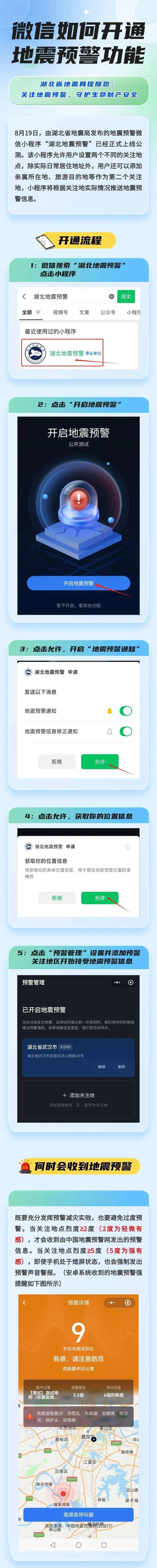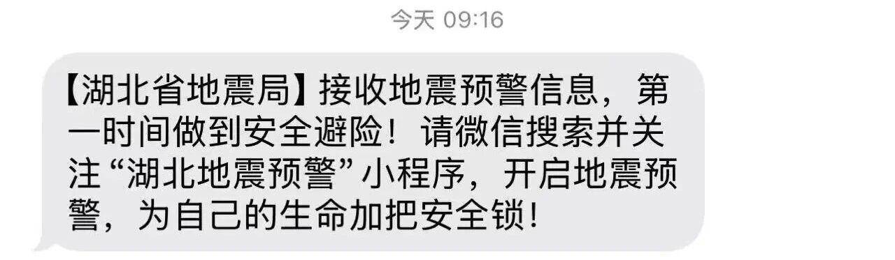 目前,湖北省地震局已經在全省范圍內多次推送了地震預警信息服務公益短信,提醒大家關注“湖北地震預警”小程序,及時接收地震預警信息,為應急避險爭取時間。