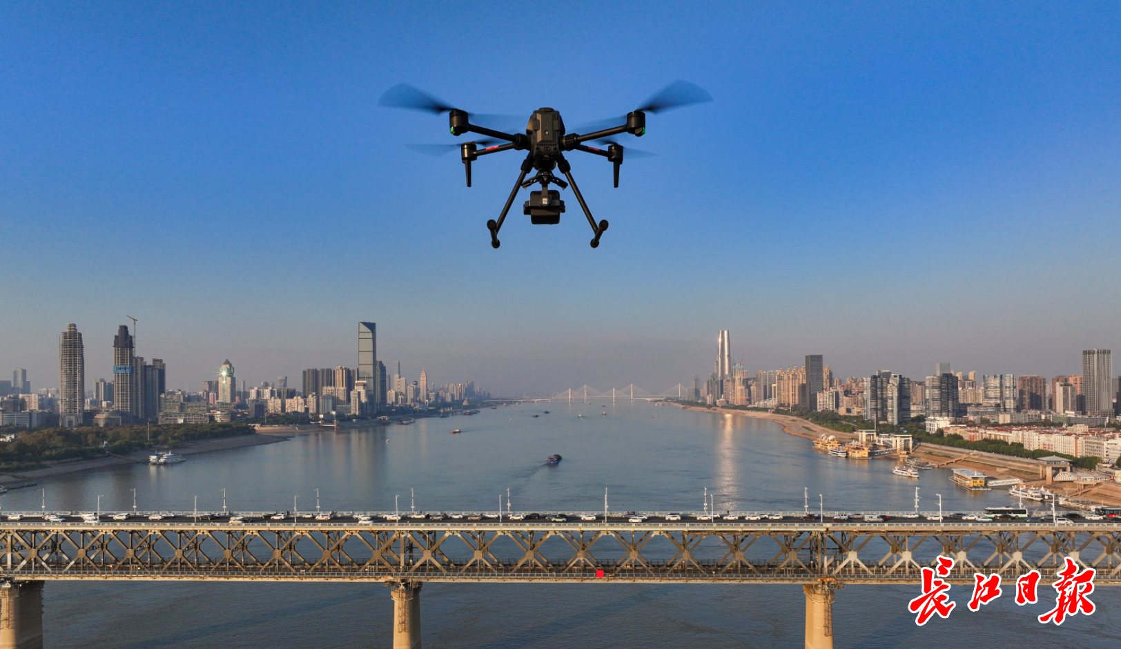 普宙科技無人機(jī)在武漢長江大橋上空往上、下游方向進(jìn)行測繪、巡檢。 長江日報記者胡冬冬 攝
