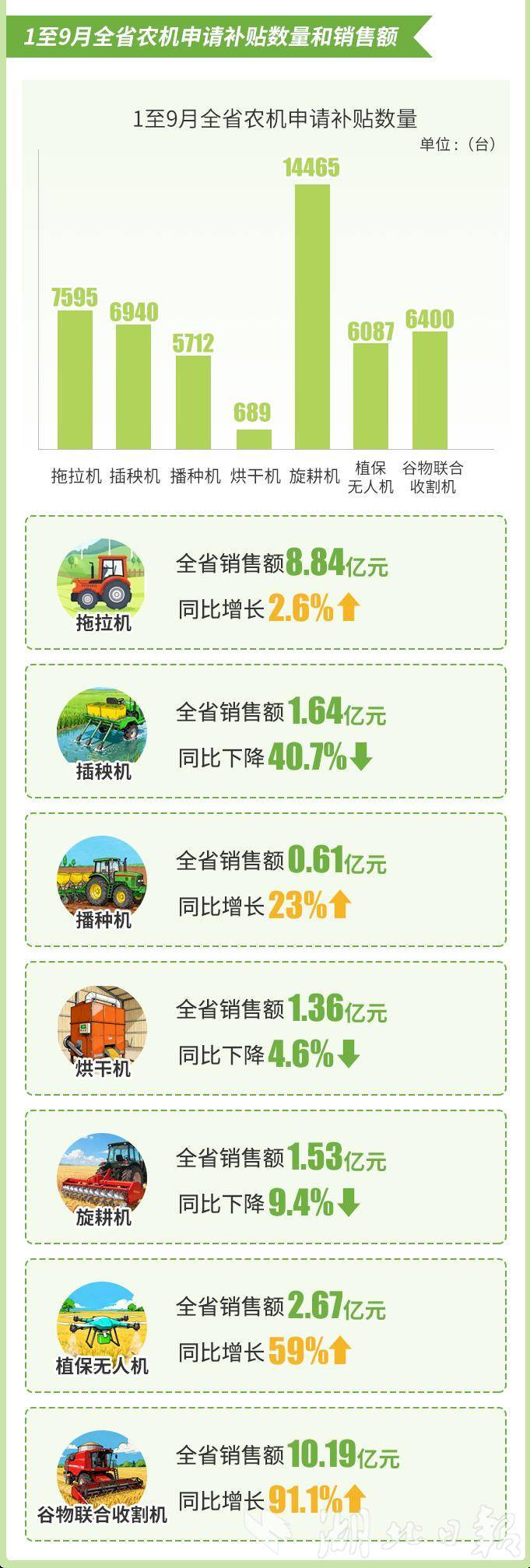 報告指出,前三季度,全省植保無人機銷售額達2.67億元、同比增長59%,谷物聯合收割機銷售額10.19億元、同比增長91.1%,播種機銷售額0.61億元、同比增長23%;插秧機銷售額1.64億元、同比下降40.7%,旋耕機銷售額1.53億元、同比下降9.4%,烘干機銷售額1.36億元、同比下降4.6%。