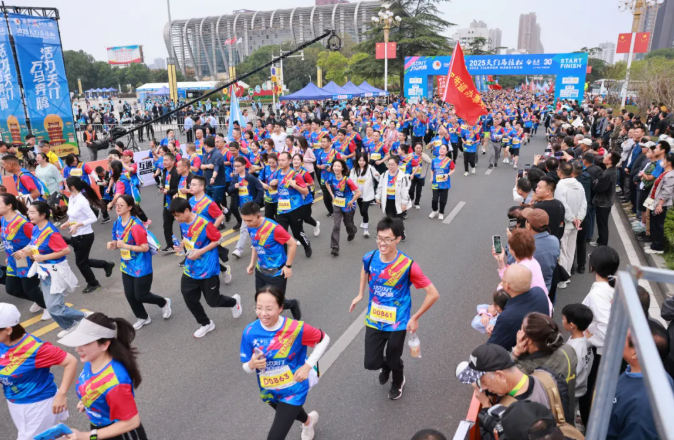 10月12日,2025天門馬拉松在陸羽廣場鳴槍開賽。