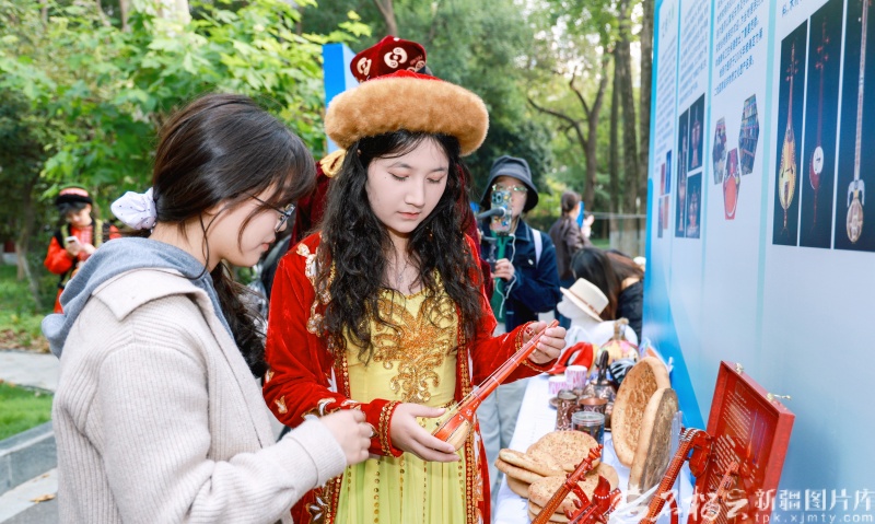 10月27日下午,南京師范大學(隨園校區)學生在欣賞新疆樂器。石榴云/新疆日報記者 甘興華攝