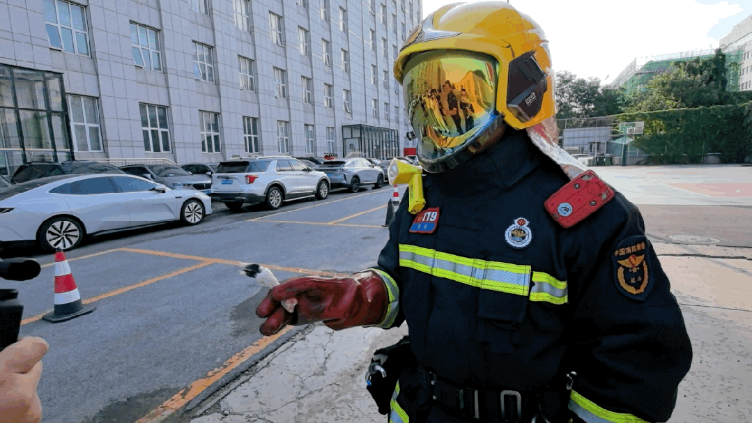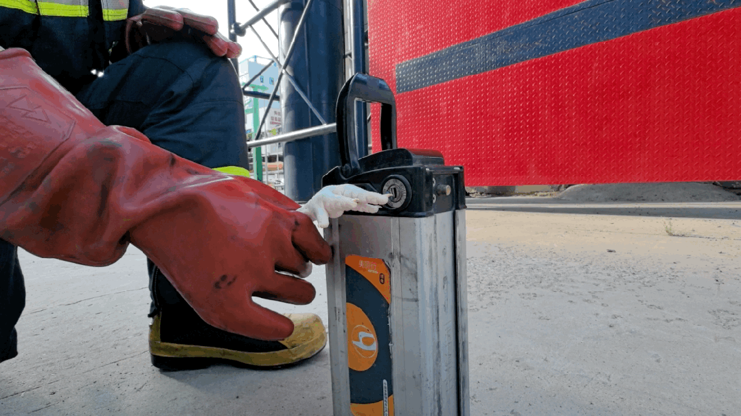 消防員用雞爪模擬人手,將一個圓形鐵片固定在雞爪上。當鐵片碰到電動車電池充電口處時,瞬間火花四濺。