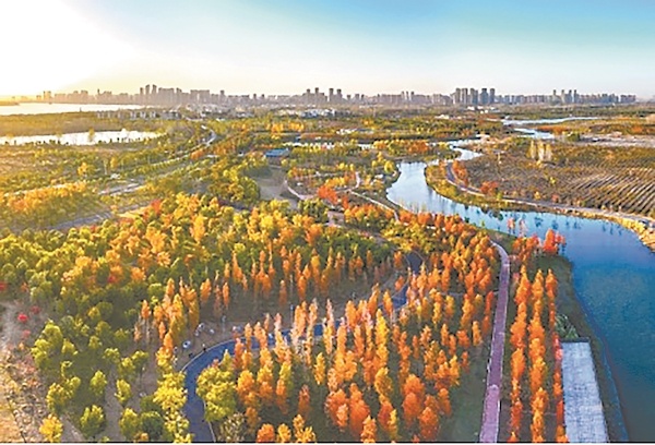 魚梁洲中央生態公園在秋風中化身為色彩斑斕的童話世界。從高空俯瞰,宛如一幅美麗的油畫。每年此時,公園內楓樹葉由綠轉黃再變紅,似調色盤上的絢麗色彩,層層疊疊,錯落有致。陽光透過葉縫灑下斑駁光影,為深秋午后增添了溫暖與詩意。襄陽古城護城河畔層林盡染,古城、護城河、彩林、步道、城市相映成景,宛如美麗的油彩畫,吸引了不少市民和游客前來打卡游玩。