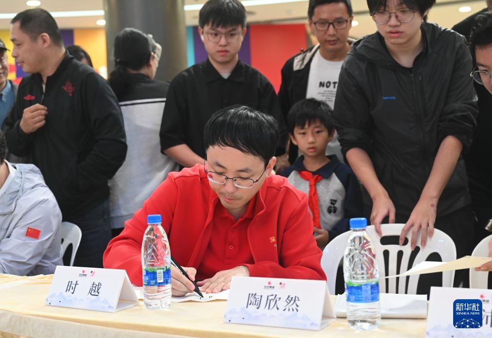 10月28日,深圳龍華隊選手時越(前)在開賽儀式現場為圍棋愛好者簽名。