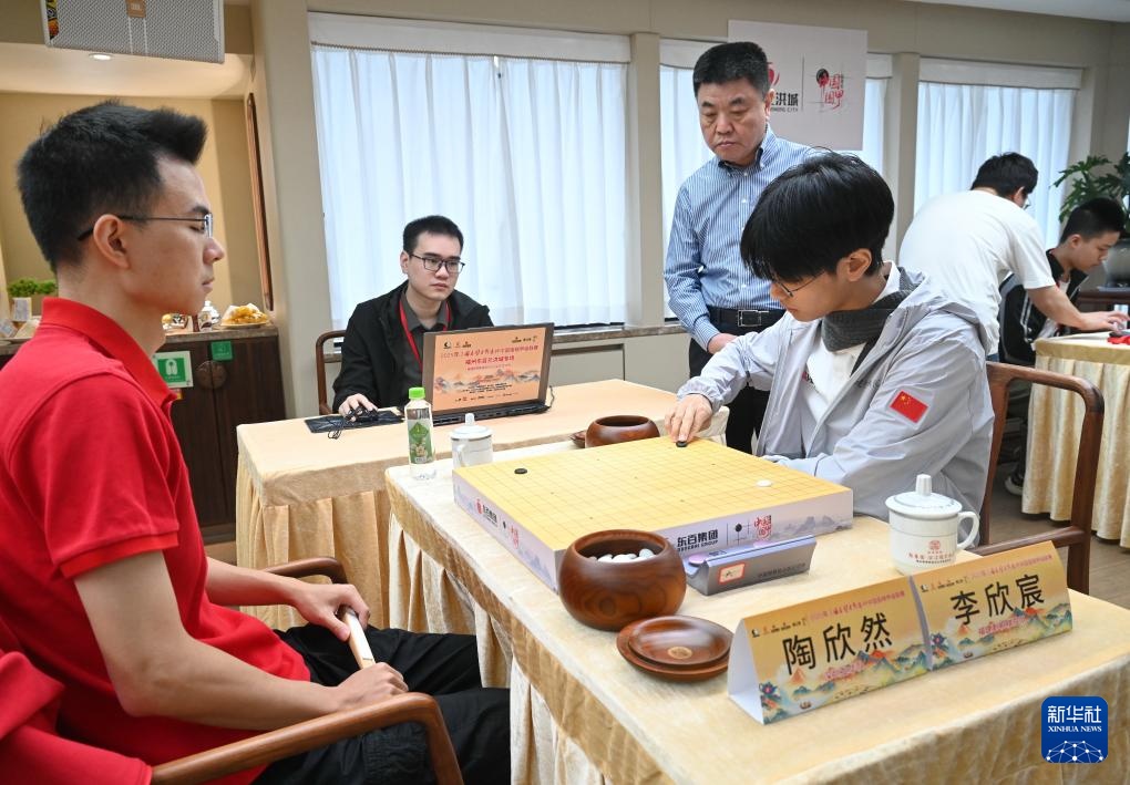 10月28日,深圳龍華隊選手陶欣然(左前)與福建刺桐棋院隊選手李欣宸(右前)在比賽中。