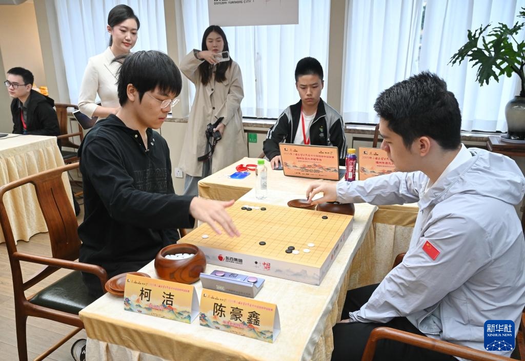 10月28日,深圳龍華隊選手柯潔(前左)與福建刺桐棋院隊選手陳豪鑫在比賽中。