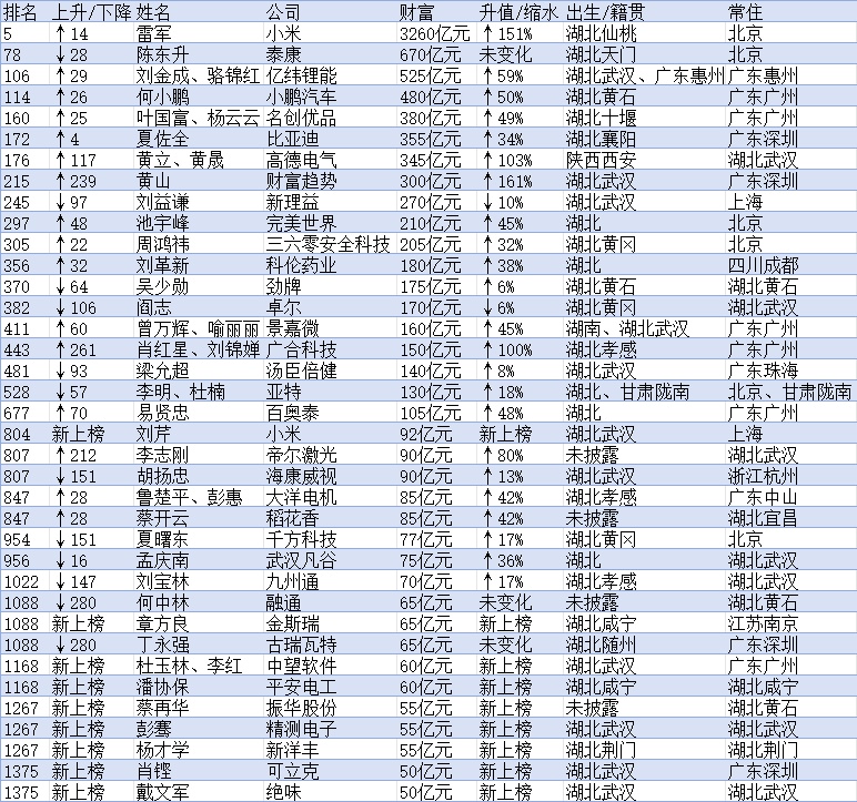 湖北仙桃人雷軍,因創(chuàng)立了小米以3260億元財(cái)富,再次位列湖北籍企業(yè)家榜首,財(cái)富相比去年升值151%,并在全榜單中的排名為第5位,相比去年上升14位。