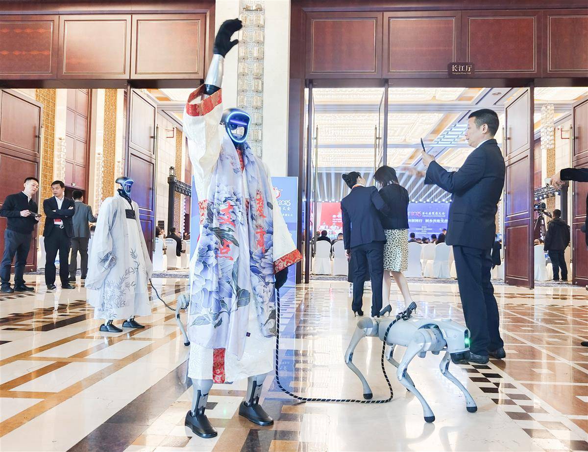 10月29日,參會楚商代表在會場外和人形機器人互動。