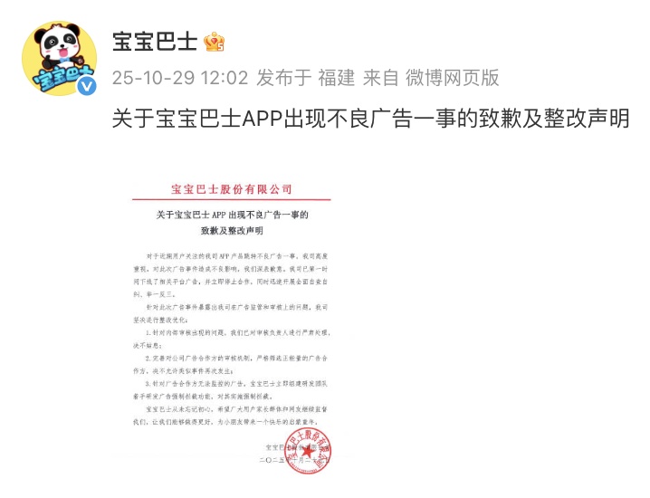 寶寶巴士股份有限公司10月29日發(fā)布《關(guān)于寶寶巴士APP出現(xiàn)不良廣告一事的致歉及整改聲明》:
