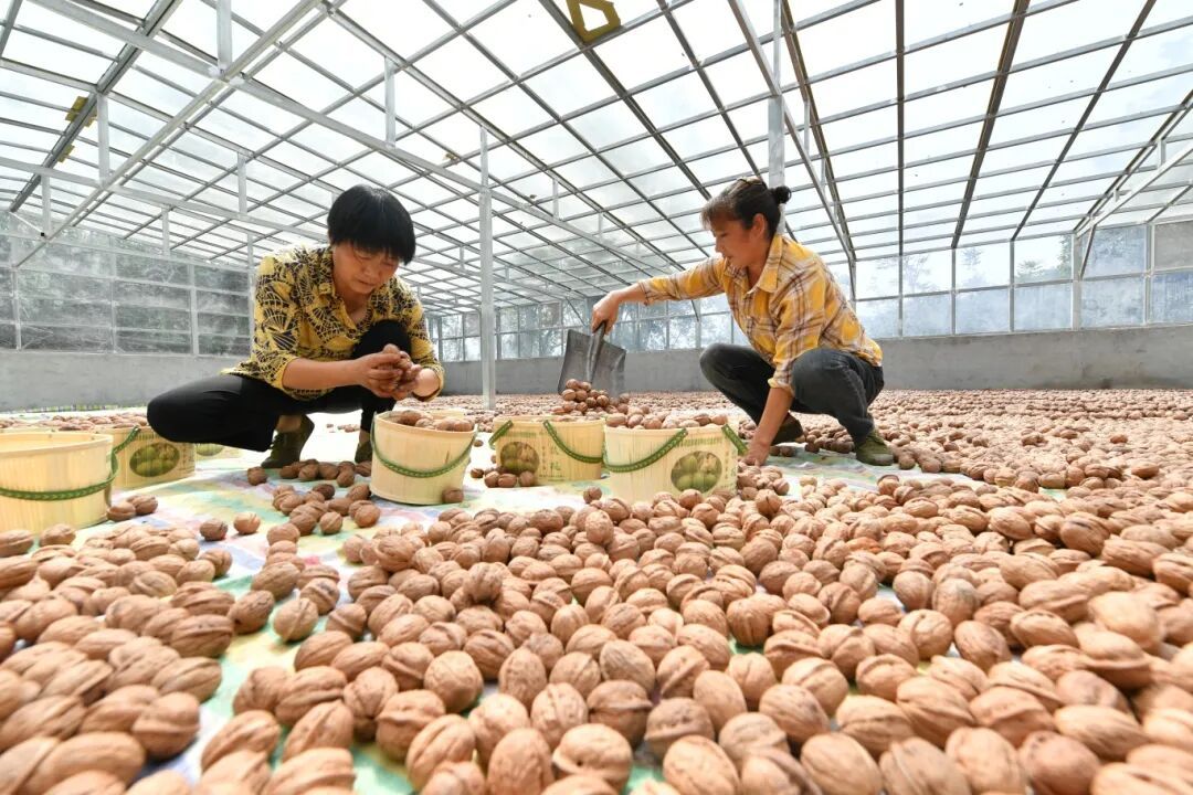 ▲村民在寺坪鎮皮家坡村“陽光曬房”分裝核桃。