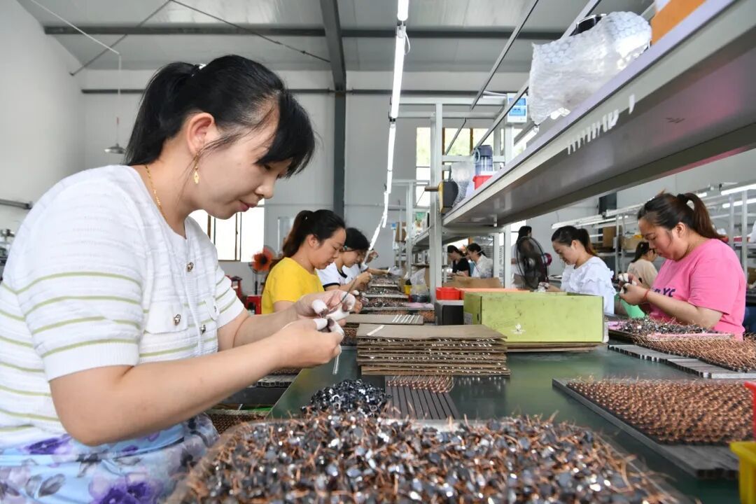 ▲村民在寺坪鎮一家鄉村微工廠加工電子元件。
