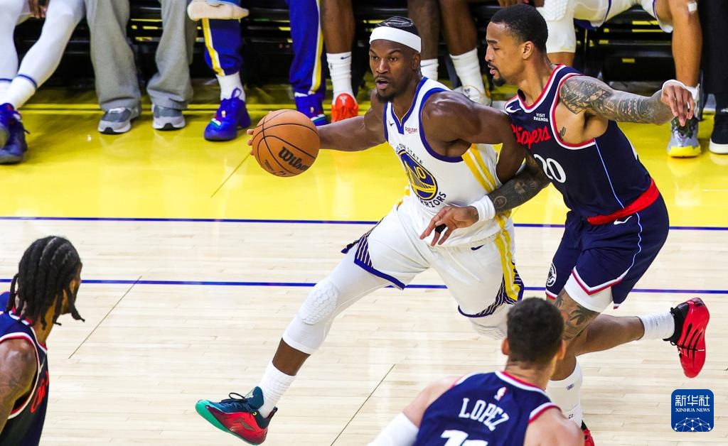 10月28日,勇士隊球員吉米·巴特勒三世(上左)在比賽中帶球突破。