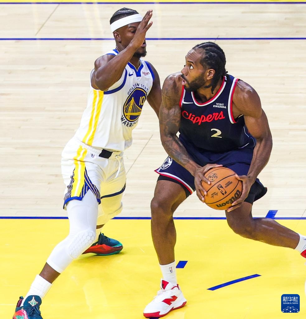 10月28日,快船隊球員倫納德(右)在比賽中帶球突破勇士隊球員吉米·巴特勒三世的防守。