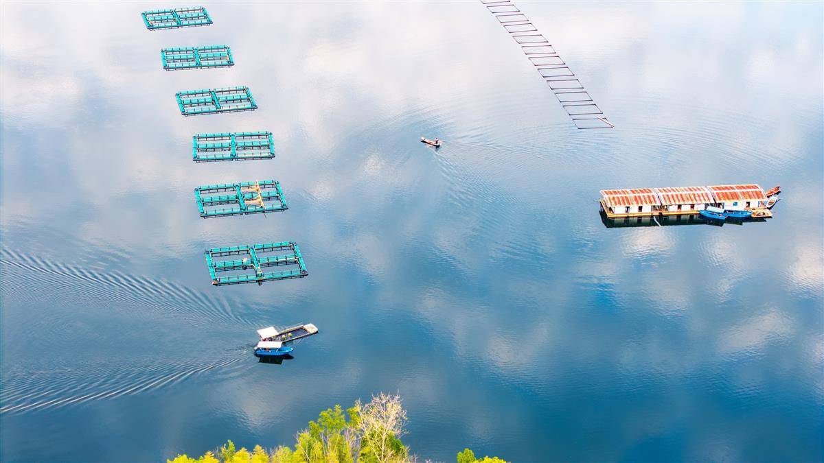 10月24日,在黃岡市白蓮河水庫水域,一個個水產(chǎn)養(yǎng)殖網(wǎng)箱整齊排布,養(yǎng)殖戶駕船在網(wǎng)箱區(qū)域忙碌,呈現(xiàn)出一幅生態(tài)養(yǎng)殖與碧水藍(lán)天相融的現(xiàn)代農(nóng)業(yè)圖景。