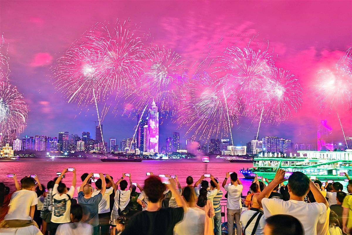 攝影發(fā)燒友范作金、羅海潤提前兩天在長江兩岸選點(diǎn),最終選定武昌江灘,他們說:“武昌江灘視野開闊無遮擋,對面漢口高樓密集,能完整呈現(xiàn)表演與城市天際線的交融,更能凸顯武漢的氣勢?!笔忻褛w妤去年拍攝長江文化藝術(shù)季開幕式的照片,登上《大眾攝影》雜志,今年她又早早選好拍攝點(diǎn):“太震撼了,希望明年有機(jī)會再來拍?!备嗟氖忻窈陀慰团e起手機(jī),照片、實(shí)況動圖、短視頻、長視頻,社交媒體上花樣繁多的同題美圖,讓外地人、外國人實(shí)名羨慕了。國外友人Edson P Bautista在湖北日報海外賬號的評論區(qū)留言:“Nice firework my friend”(我的朋友,這煙花太棒了)。俄羅斯女孩@超愛麗娜在中文社交平臺分享了自己的觀禮感受:“說實(shí)話,我真的很羨慕中國人?!?/p>