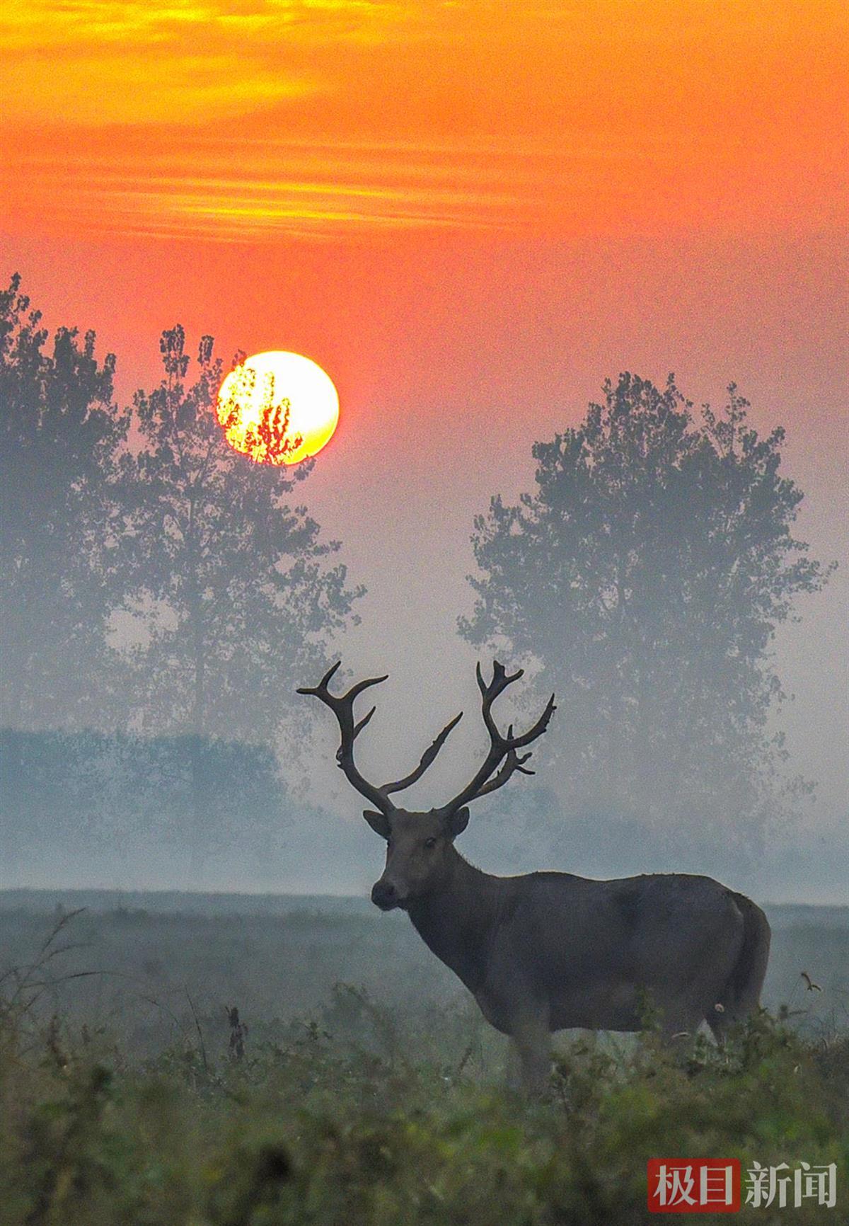 石首麋鹿國家級自然保護區(qū),一頭麋鹿在朝陽下覓食(極目新聞記者 黃志剛 攝)