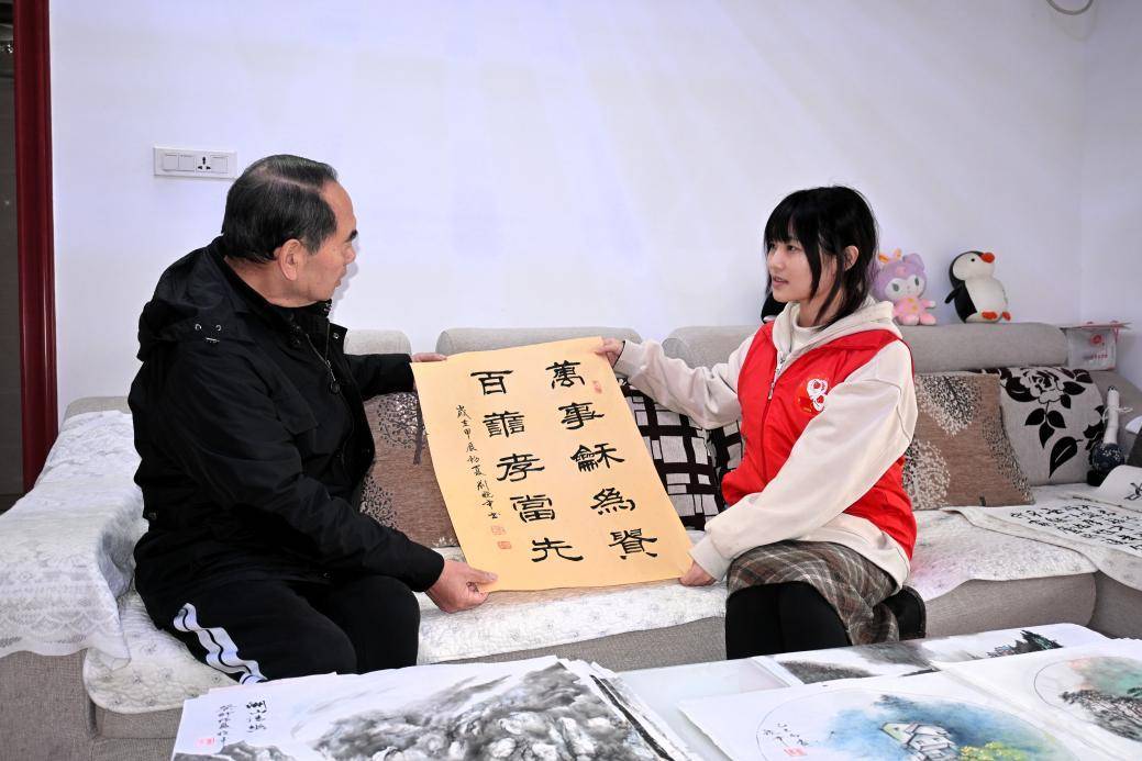 在給老人們傳授新技能的同時(shí),志愿者們也成為了傳統(tǒng)技藝的聆聽者與記錄者——書畫達(dá)人劉老師展卷揮毫,“百善孝為先,萬事和為貴”十二字遒勁灑脫,引得同學(xué)們贊嘆連連;詩詞“發(fā)燒友”王老師即興吟誦原創(chuàng)詩篇《看漁門拆遷原址還建并更名“九龍灣”所感》,讓大家在平仄韻律中感受到城市的變遷。